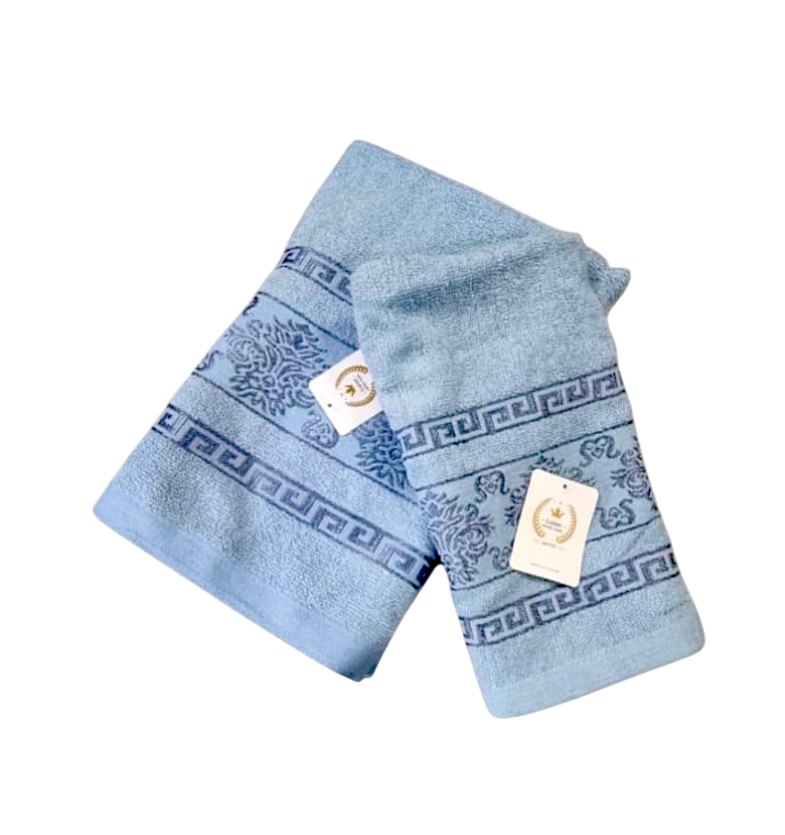 Toalla de baño + toalla de mano. La toalla de baño posee 145cm x 70cm. Y la toalla de mano posee 90cm x 45cm
